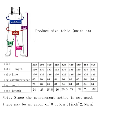 Maatmeting en aangepaste pasvorm: voor verschillende metingen. Aandacht dat de grootte van de waders handmatig wordt gemeten, dus er zijn bepaalde verschillen. Als u nog vragen heeft voordat u koopt, stuur ons dan een e-mail zonder aarzeling. Als u een brede voeten hebt of u dikke sokken moet dragen, raden we u aan een of twee maten groter dan gebruikelijke waders te kiezen.